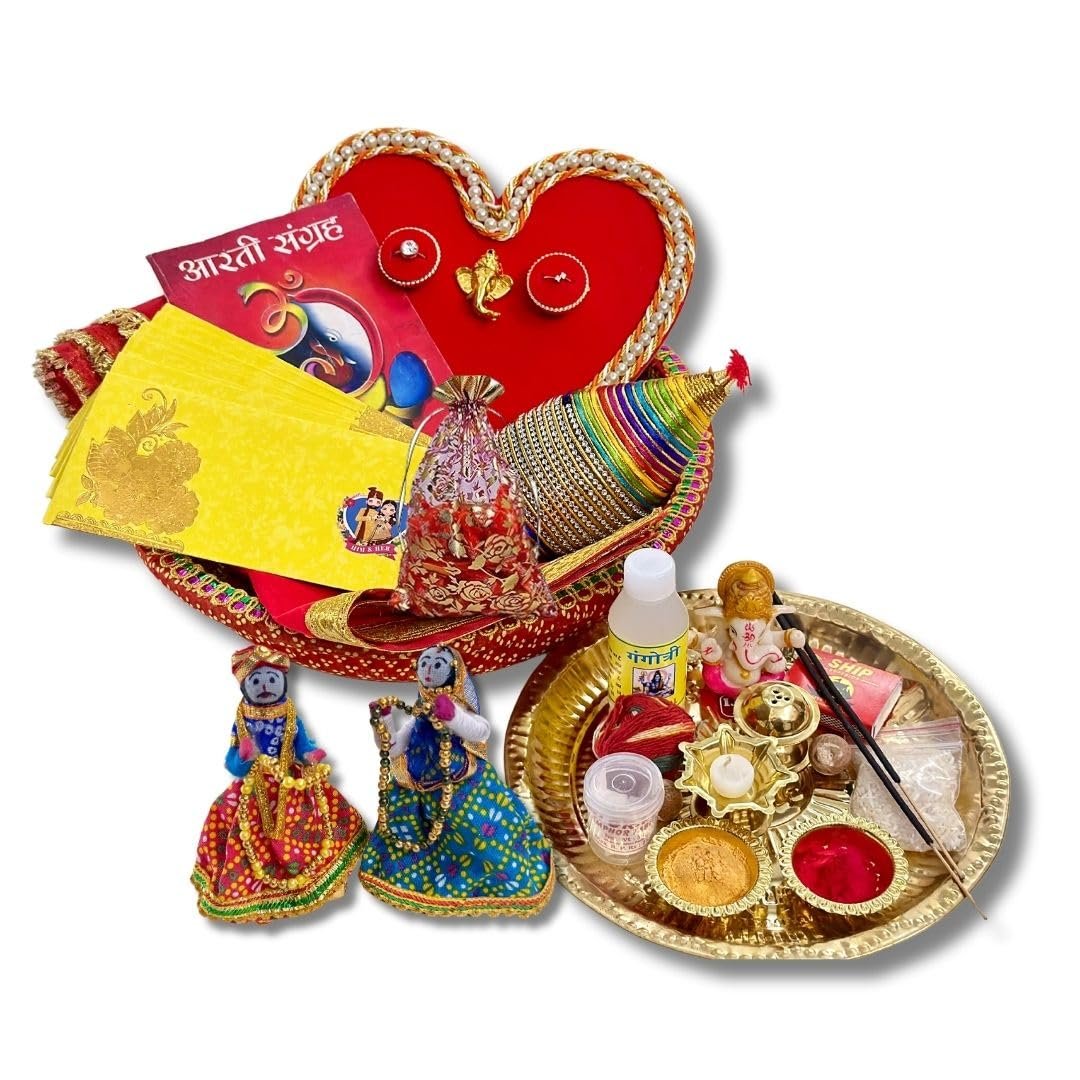 • Heart Shaped Velvet Red Ring plate, Decorated Nariyal, Shagun envelopes with Dulha Dulhan Stickers, Red Velvet Aasan Kapda for Dulha and Dulhan (2), Bride Chunnri/ Dupatta, Bandhani decorated Tokri/ Basket, Aarti Book, Ganpati Idol, Brass Aarti Thali, Vaati (2), Diya, Agarbatti Holder with Free items (Haldi, Kumkum, Akshat, Supari- 5, Ghee wick-4, Kaleva/ Red Dhaaga, Agarbatti- 5, Matchbox, Gangajal, Kapoor)
