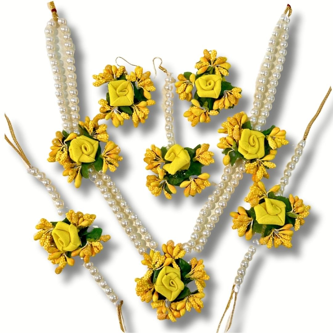 During Indian Traditional Weddings it is customary to bathe the Bride and groom with Haldi, a couple of days before the marriage, The Bride dresses in Yellow wearing classy and instagrammable artificial Floral Jewellery.