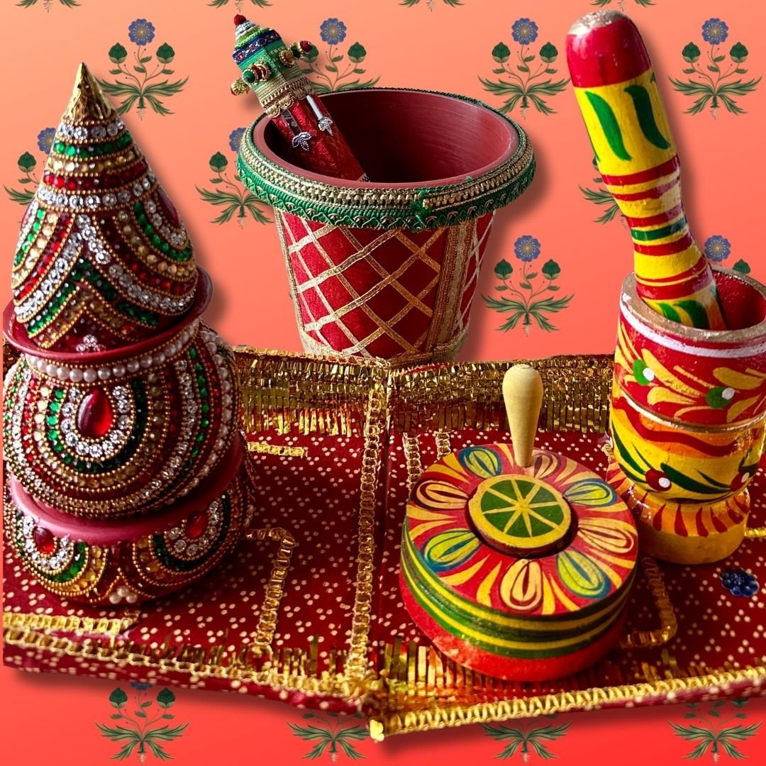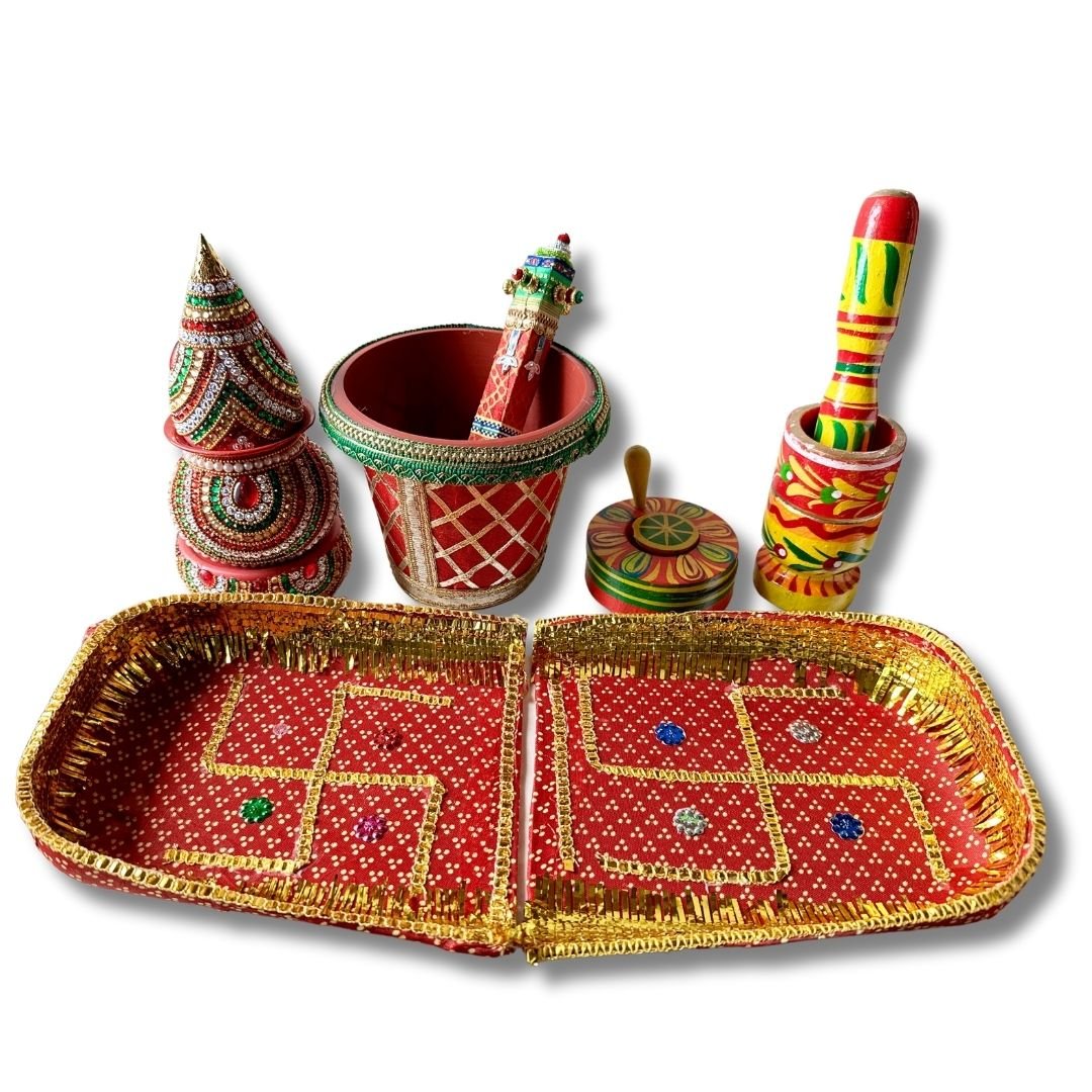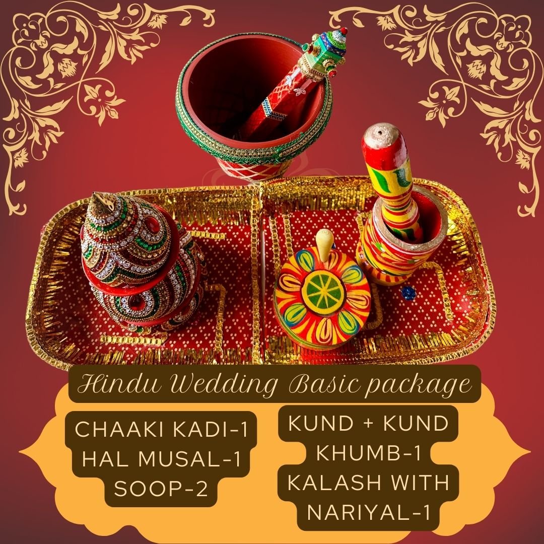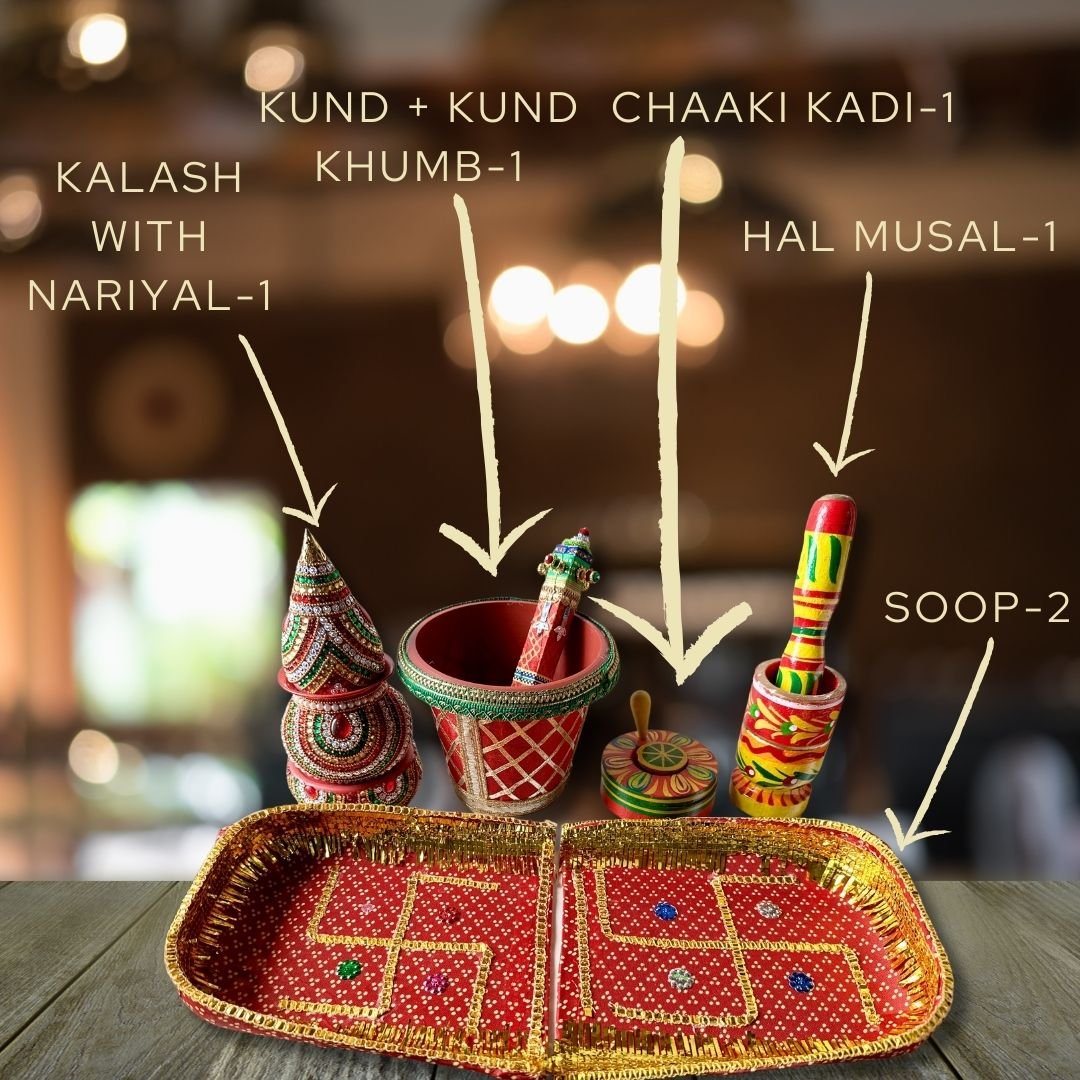 | What is in the box? | ‎1 CHAKKI +1 KADI, 1 HAL + 1 MOOSAL, 1 KALASH WITH NARIYAL, 1 KUND + 1 STAMBH, 2 SOOP |