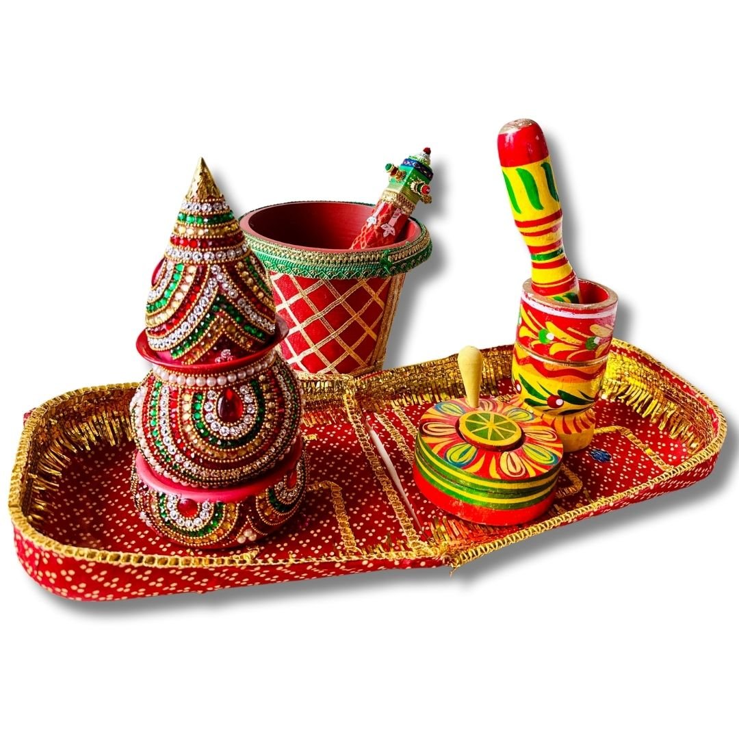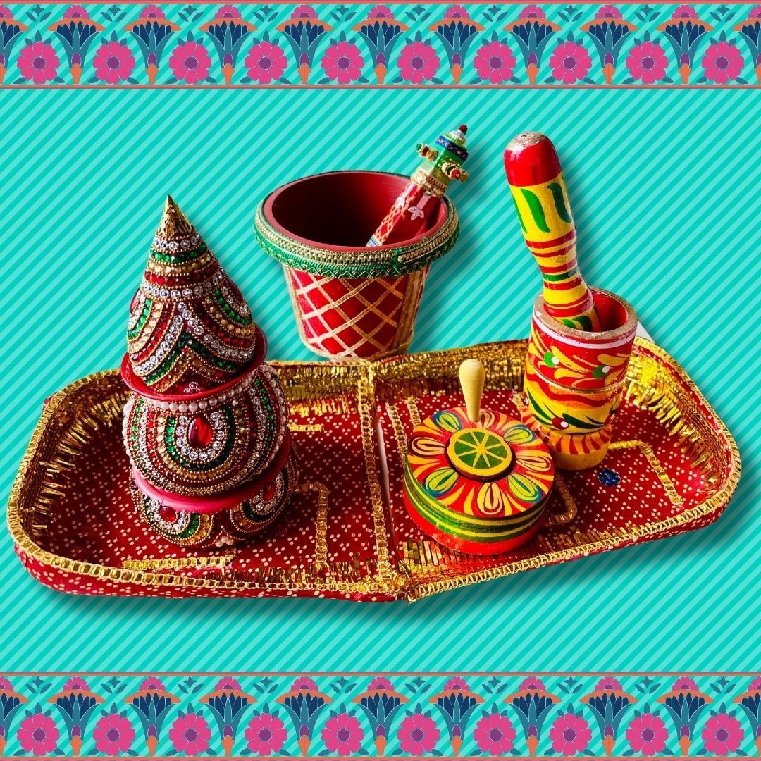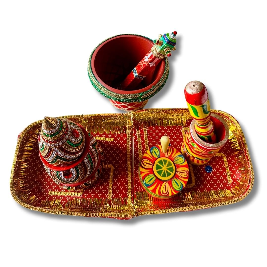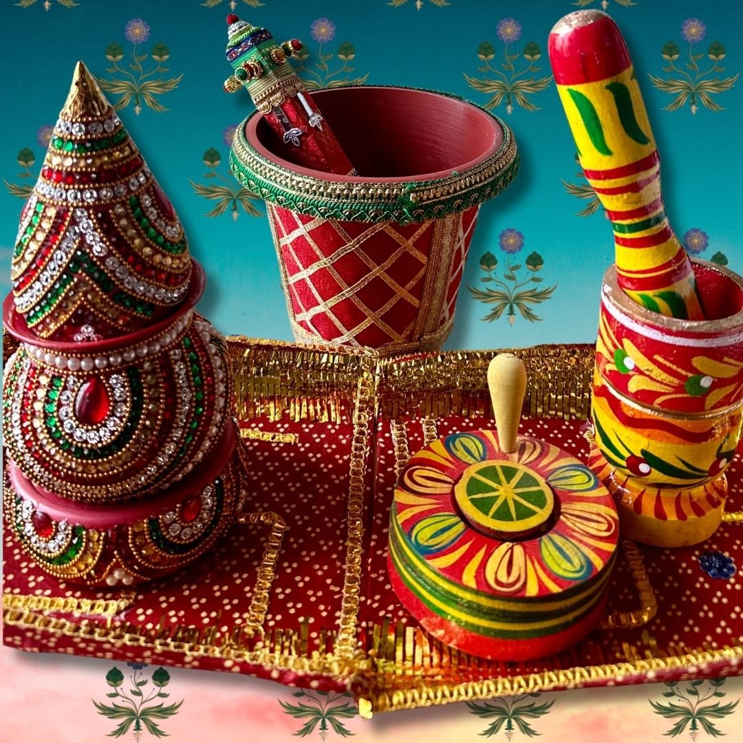 | What is in the box? | ‎1 CHAKKI +1 KADI, 1 HAL + 1 MOOSAL, 1 KALASH WITH NARIYAL, 1 KUND + 1 STAMBH, 2 SOOP |