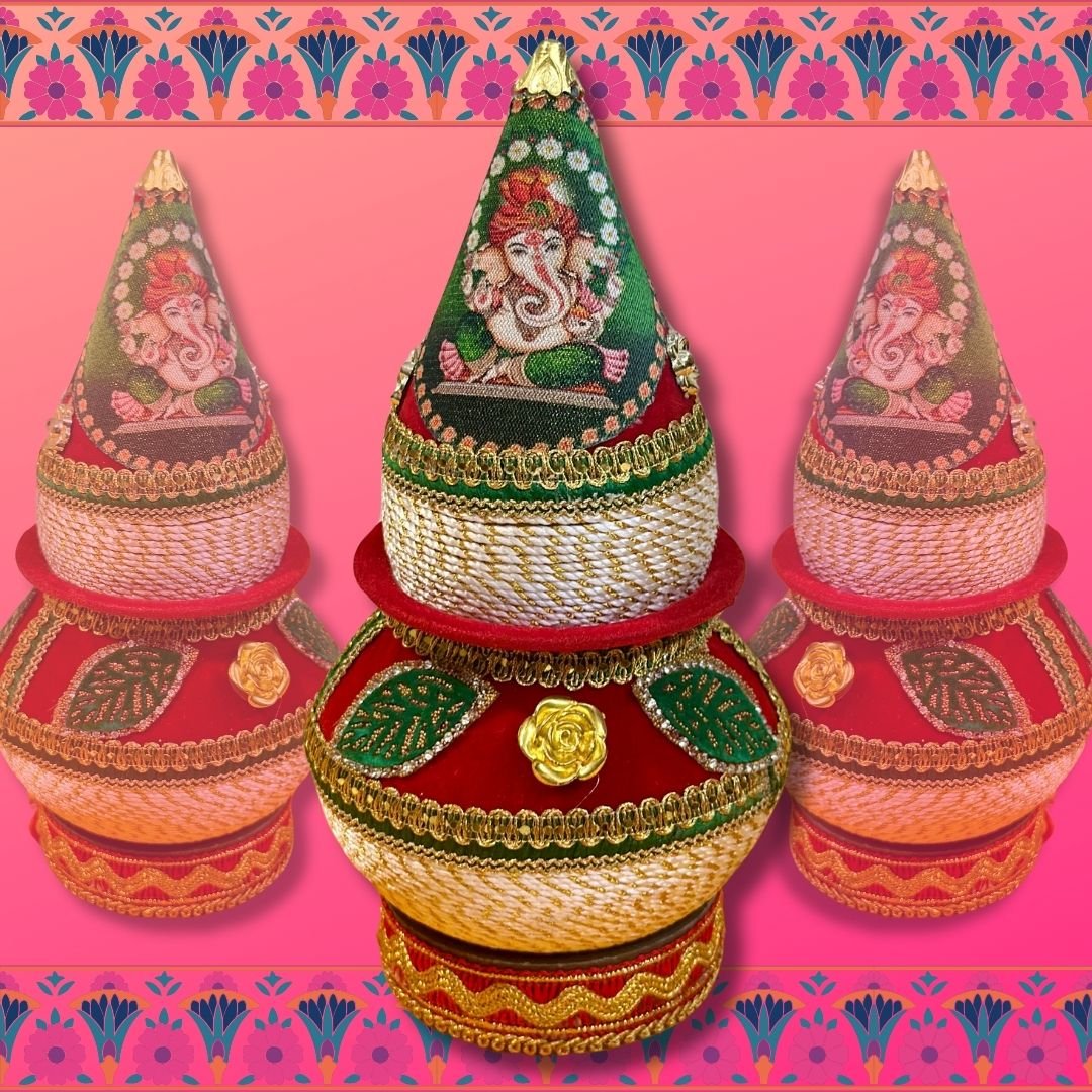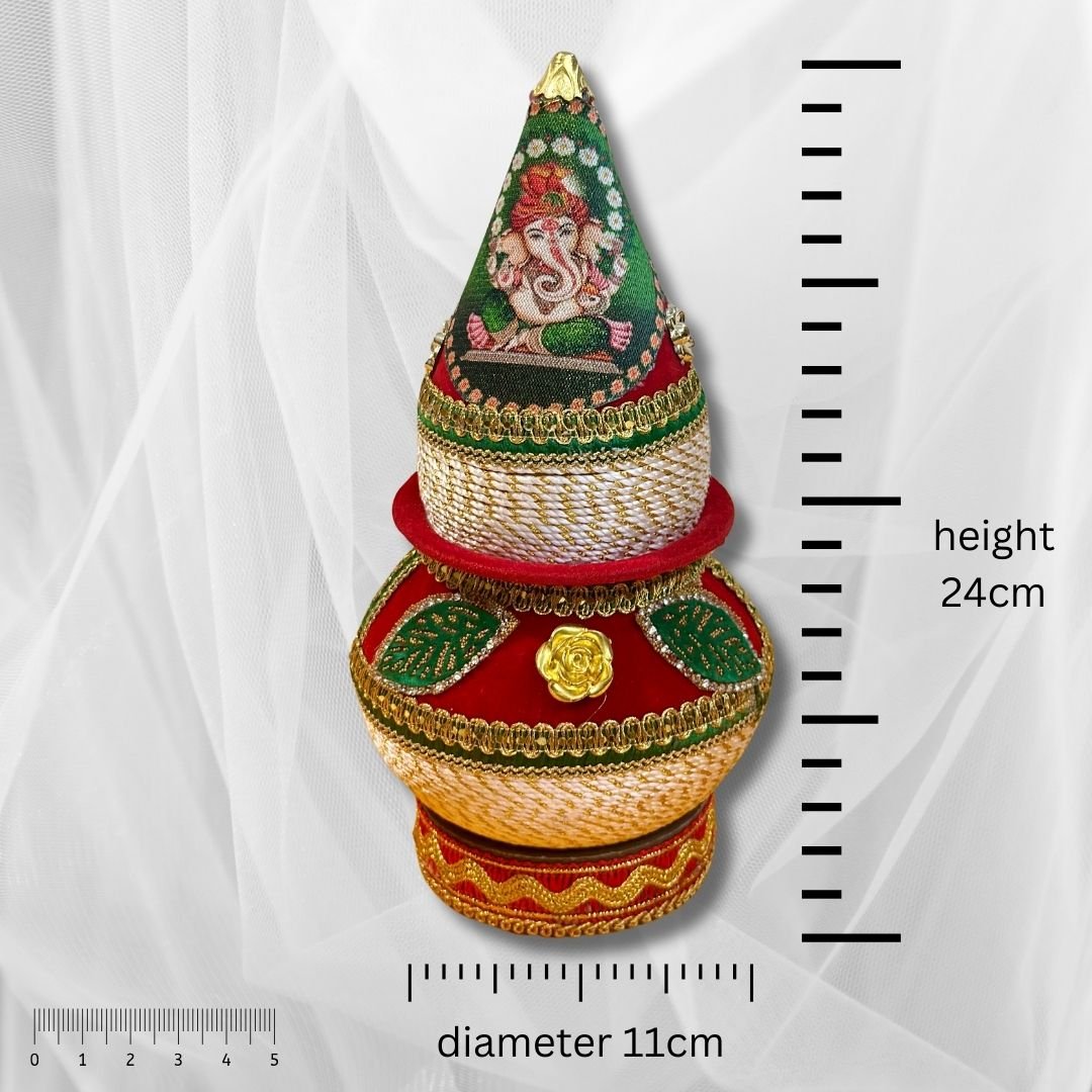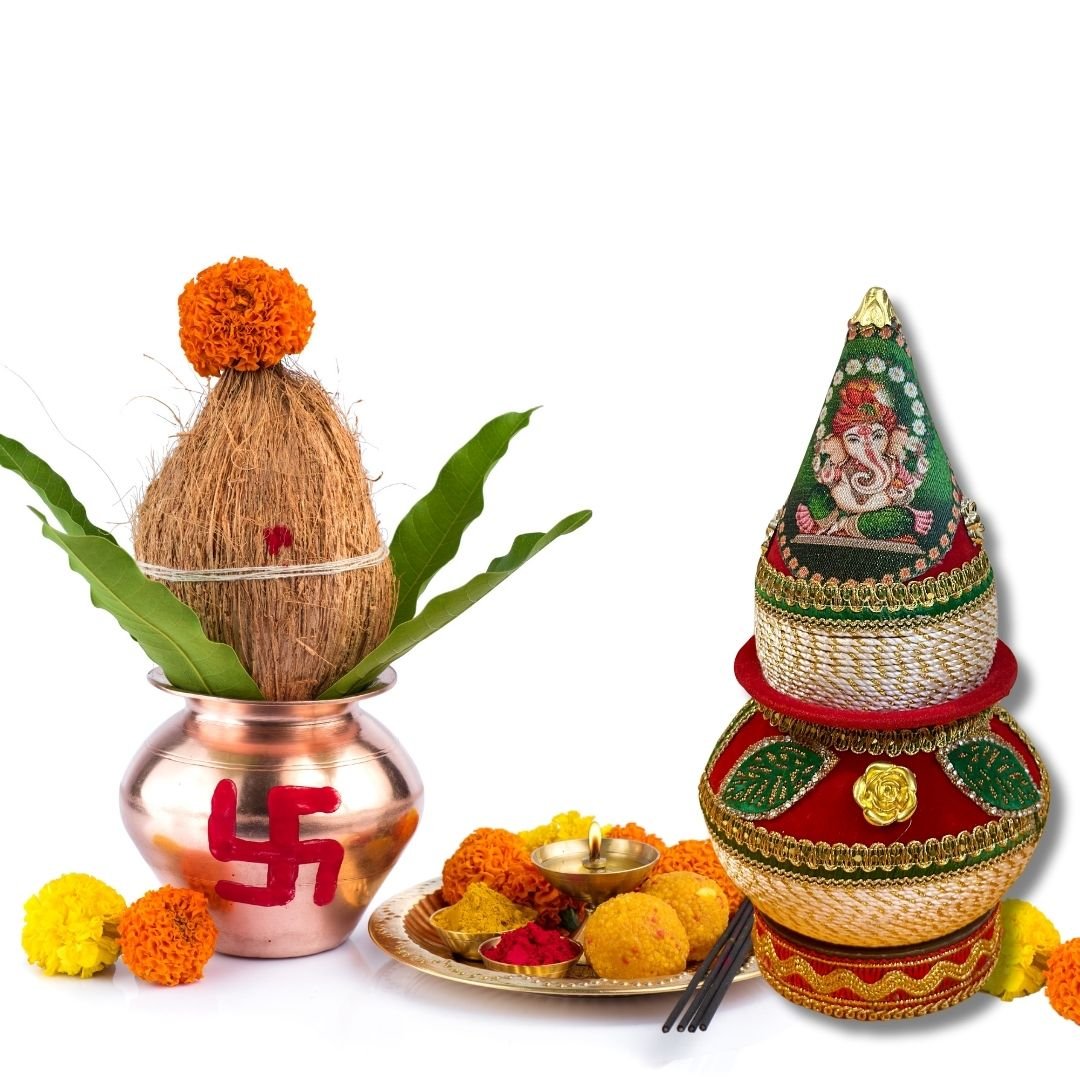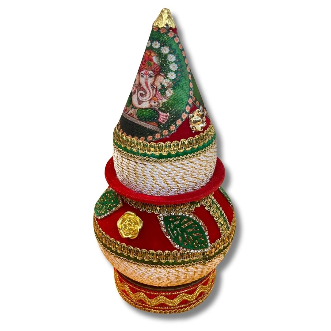 - CONTENTS: Decorated Metal Mangal Kalash with Wooden Nariyal