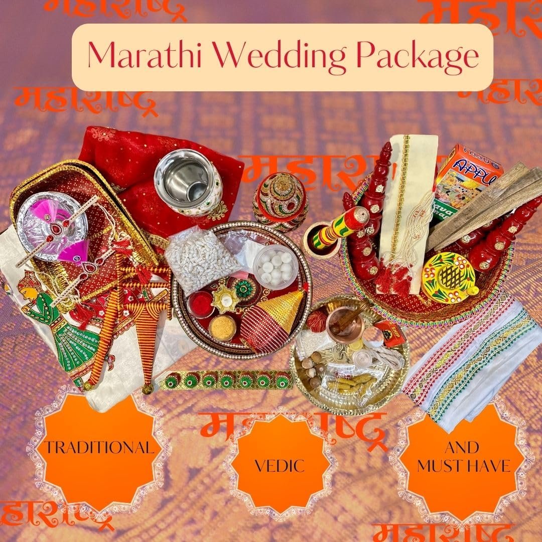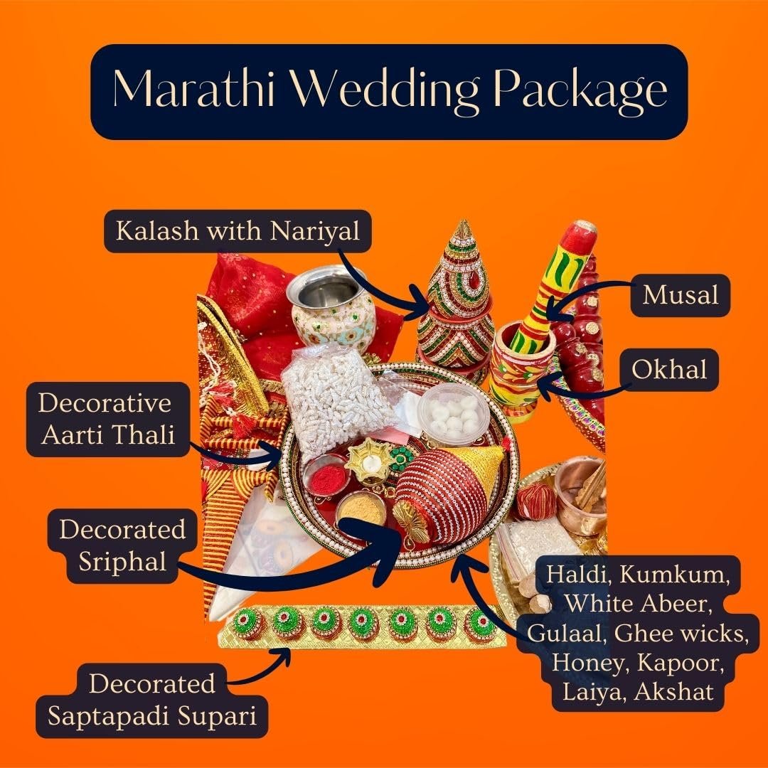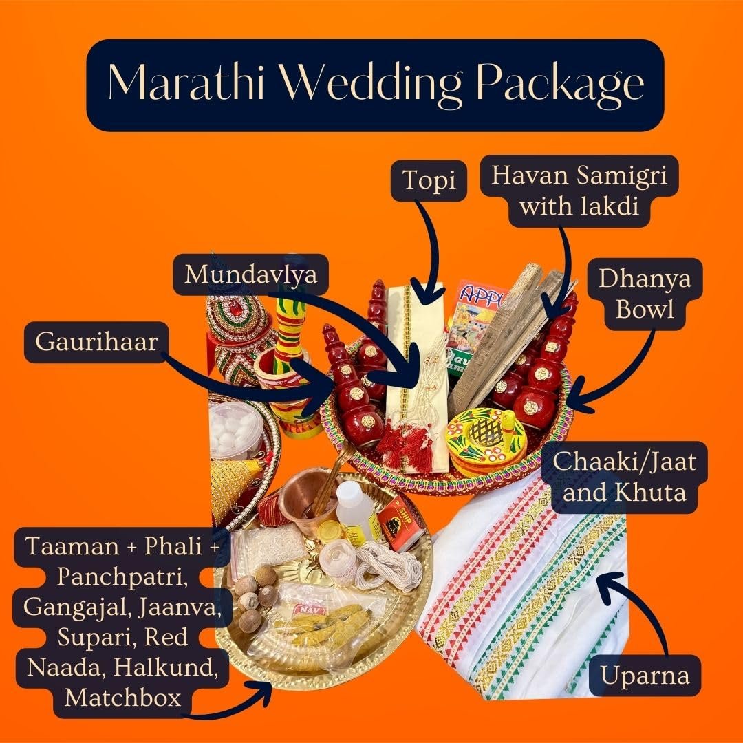 | What is in the box? | ‎Decorated Aarti Thali 2 vati Taman PhaliPanchpatri, Decorated Sriphal, Brass Thali, Diva, Laiya, Dhanya Bowl, Gaurihaar, Bashing, Mundavlya, Gangajal, Matchbox, Jaanva, Ghee wicks, Haldi Kumkum Abeer Akshat Kapoor Supari Gulaal, Halkund, Soop, Honey, Havan Samigri, Havan Ki lakdi, Red Naada, Jaat, Khuta, Okhal, Musal, MangalKalash, Designer Saptapadi Supari, Foil Dron, Topi, Uparna, Shela, Antarpaat, Katyaar, Churi |