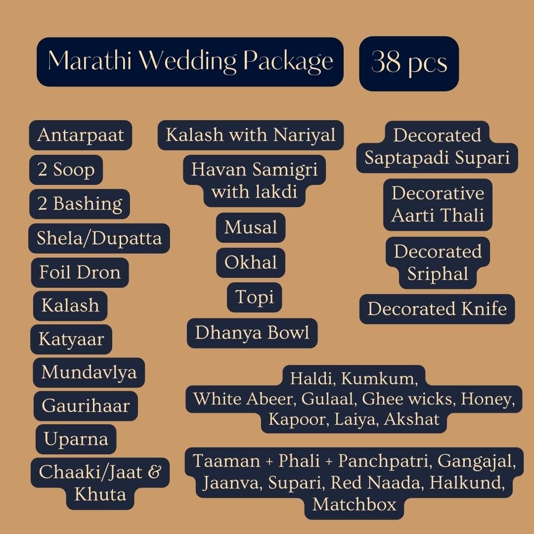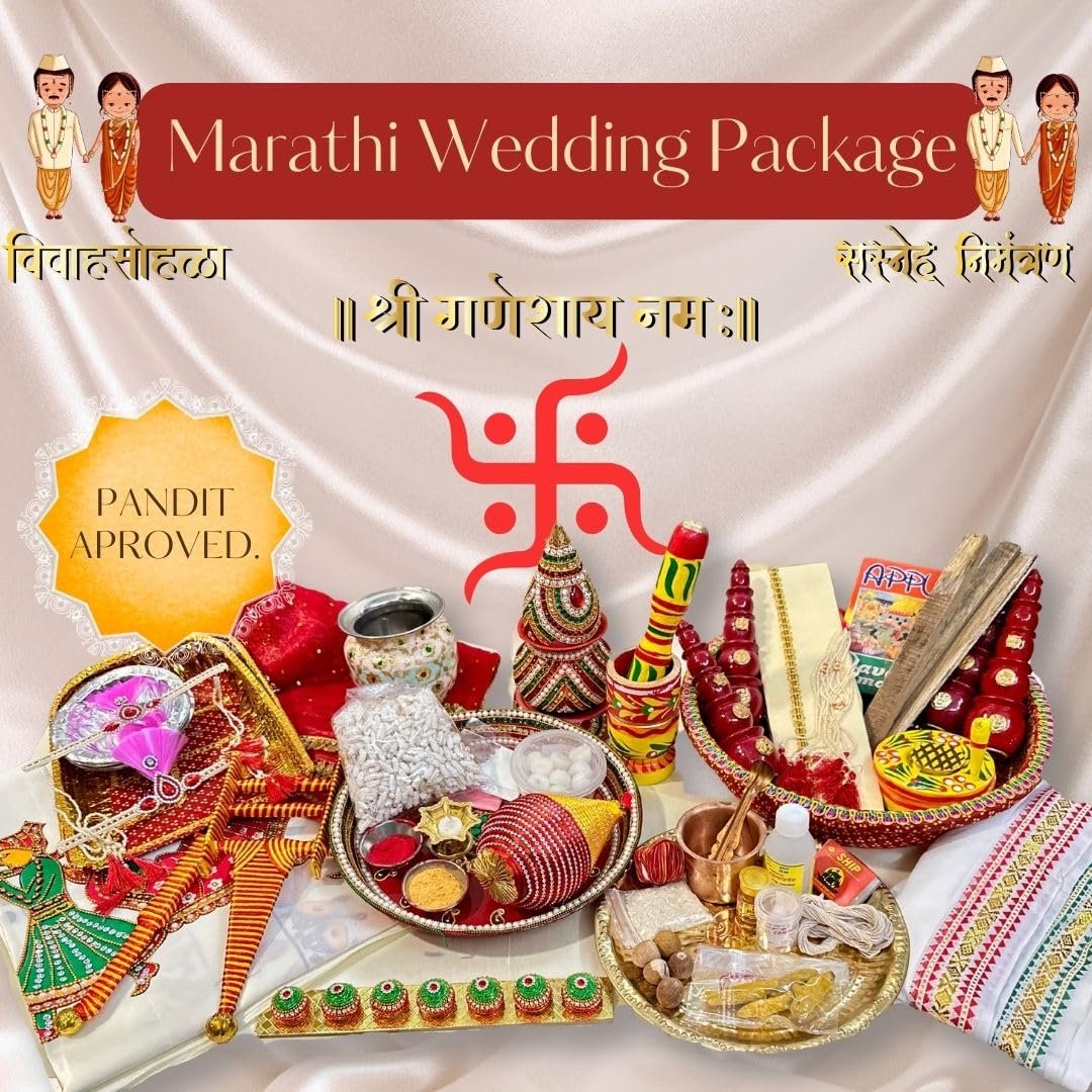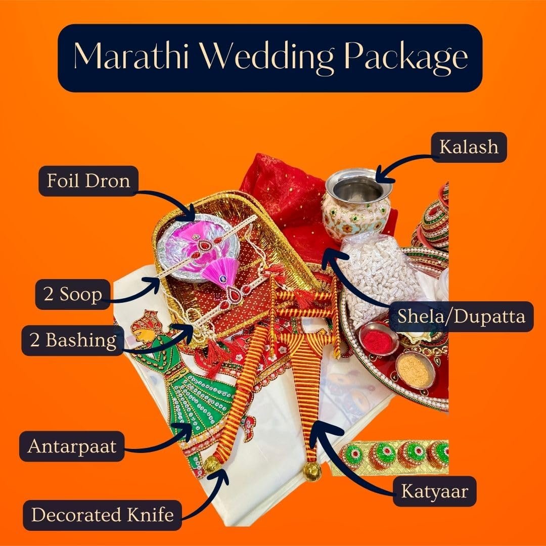 | What is in the box? | ‎Decorated Aarti Thali 2 vati Taman PhaliPanchpatri, Decorated Sriphal, Brass Thali, Diva, Laiya, Dhanya Bowl, Gaurihaar, Bashing, Mundavlya, Gangajal, Matchbox, Jaanva, Ghee wicks, Haldi Kumkum Abeer Akshat Kapoor Supari Gulaal, Halkund, Soop, Honey, Havan Samigri, Havan Ki lakdi, Red Naada, Jaat, Khuta, Okhal, Musal, MangalKalash, Designer Saptapadi Supari, Foil Dron, Topi, Uparna, Shela, Antarpaat, Katyaar, Churi |