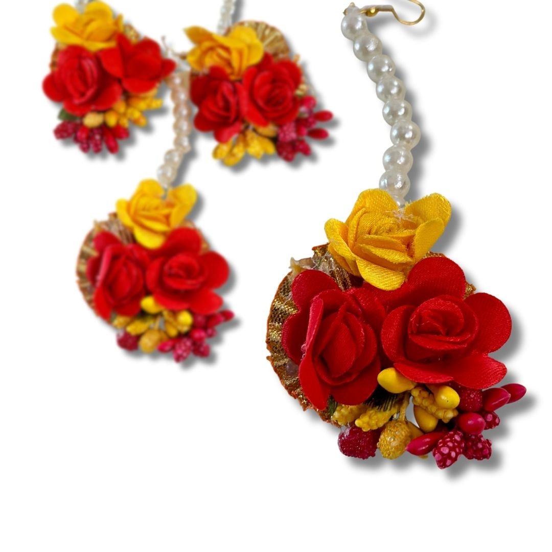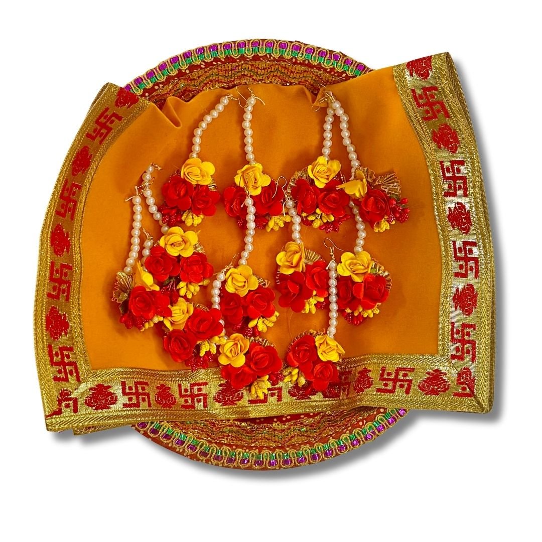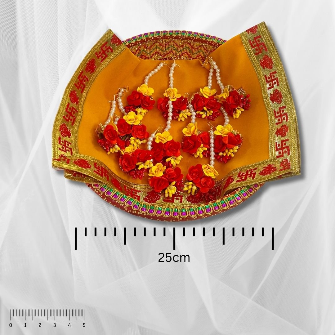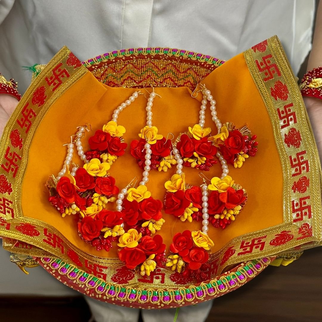 Description: Red Yellow Maang Tikkas flower jewellery for Women Ladies for haldi photos. Yellow aasan Kapda for bride or groom to sit on. Bandhani Decorated Basket Multipurpose for Haldi Ceremony.