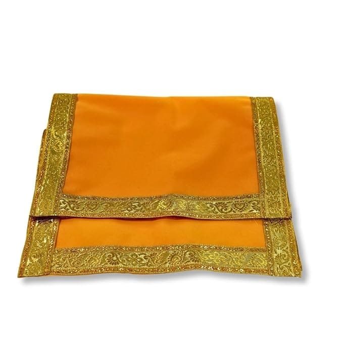 - Velvet puja aasan are ideal for placing deity idols during puja rituals. It can also be used to cover the head of deity idols. To enhance the look of this designer yellow puja aasan golden zari border made swastik design is used along the corners of this cloth, the elegant design combination of the cloth gives this yellow asana a very lustrous royal feel. The Velvet Puja Chowki Aasan is comfortable and can be easily hand washed.