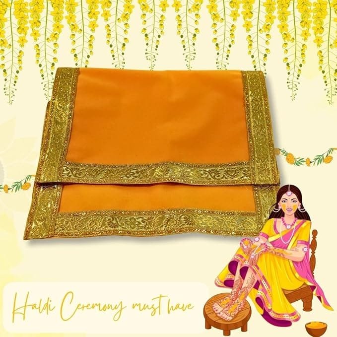 - Description: This Yellow Velvet Cloth/ Aasan for God Chowki is made up of 100% pure quality micro velvet fabric. This Golden border Jari Pooja Aasan Cloth can be used as base of your temple especially on the chowki of Haldi ceremony decoration or any Puja / Hawan or you can place it on Mata ki Chowki, Puja tables, deity thrones, wooden bajot, pedestals etc.
